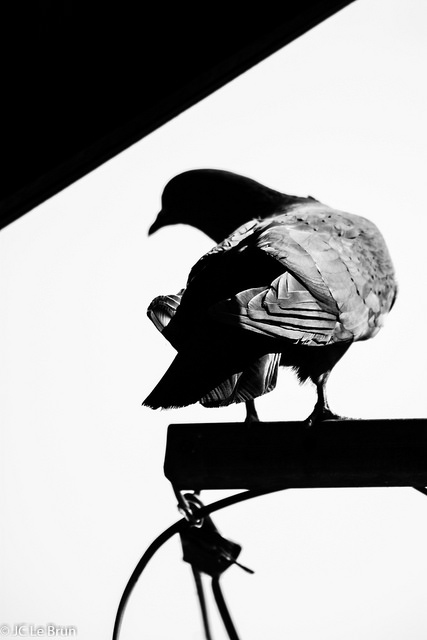 Le pigeon fait partie d’une famille qui s’est installée au pignon de notre vieille bâtisse, juste sous les toits. Depuis quelques jours je voulais tirer le portrait de ce nouveau locataire.