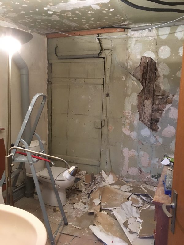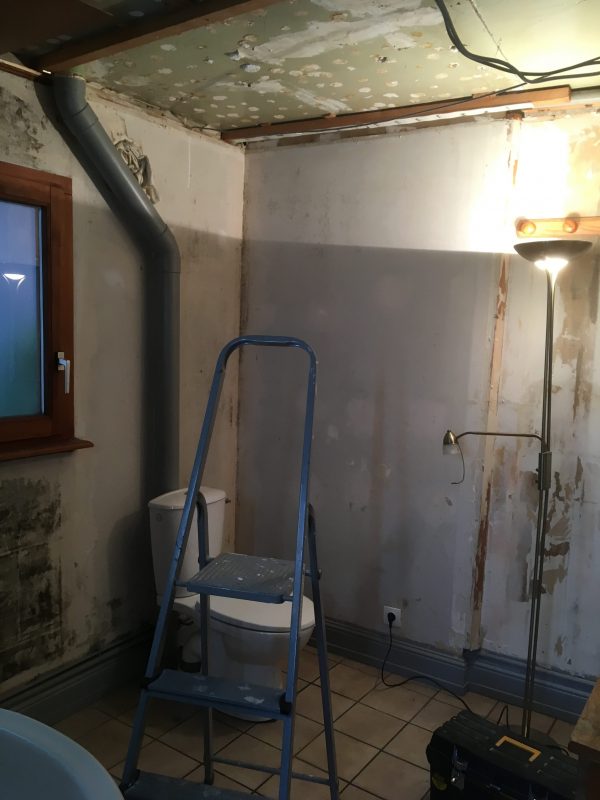 Soixante dix heures pour casser un plafond, une cloison, réfléchir, douter, essayer, recommencer, câbler le circuit électrique, poser les pitons et les fourrures, installer la ventilation, poser les rails et les montants, visser, percer, déplacer les WC, poser de la laine de bois et faire de nombreux aller retour chez Leroy Merlin et la déchetterie.