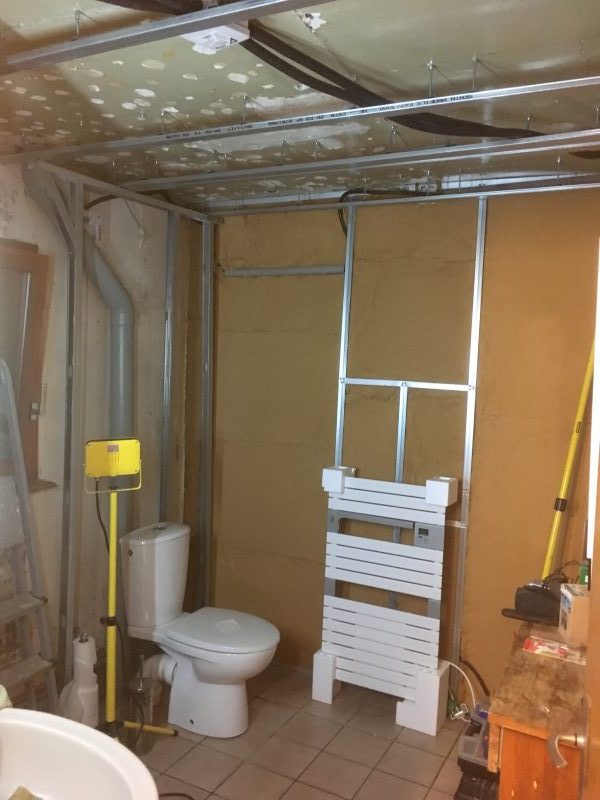 A l’heure qu’il est, j’ai un mur de posé, une ventilation opérationnelle, un sèche serviette qui chauffe, un câblage électrique tout neuf et des armatures métalliques au plafond et sur les murs.