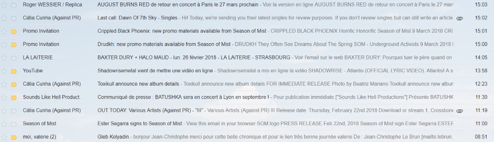 Puis on rallume l’ordinateur pour consulter une fois encore les médias sociaux, répondre aux messages et ouvrir la boite mail, la boite qui s’est remplie au fil des heures de vidéos, de promotions numériques, d’annonces de concerts, de sorties d’albums, de sollicitations d’artistes, la boite mail qui ne désemplit pas chaque jour, même le weekend et dont il faut consulter attentivement chaque message pour ne pas manquer une information essentielle. Les vidéos seront vites triées, s’il s’agit d’une sortie d’album, on garde, sinon on jette le plus souvent, après tout, tout le monde peut aller sur Youtube. Pour les promotions, il y a des labels et promoteurs qui auront notre priorité, le black metal arrivant en queue de peloton devant toutefois le punk, la pop française et la new wave. Un premier tri vertical avant de commencer à écouter quelques extraits et poursuivre l’écrémage jusqu’à ne garder qu’une ou deux promotions généralement sur la dizaine quotidienne. Ils faut également répondre aux sollicitations diverses, demande de chronique, d’interviews, de couverture de concert et que sais-je encore. Vers 18h, il est temps de préparer les actualités du lendemain, la chronique du jour, les dates de concerts, les albums à venir et de vider la boite mail. Il reste encore un peu de temps alors pour écouter de la musique tout en préparant le repas du soir et en partageant les promotions. Vers 20h30 le WIFI se coupe dans la maison pour nous préserver des ‘ondes’ mais principalement pour déconnecter un peu, lire un livre, écouter de la musique pour le plaisir ou regarder une série télé et puis dormir.